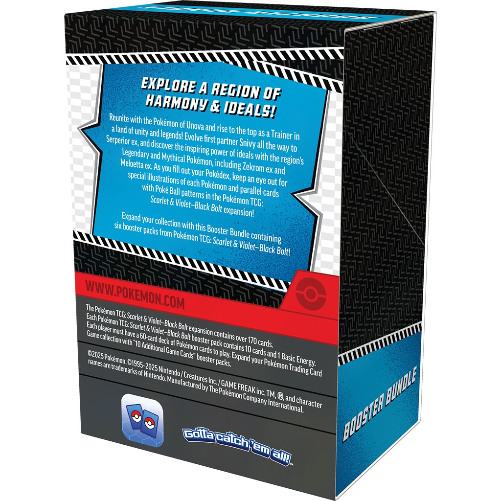 Reunite with the Pokémon of Unova and rise to the top as a Trainer in a land of unity and legends! Evolve first partner Snivy all the way to Serperior ex, and discover the inspiring power of ideals with the region’s Legendary and Mythical Pokémon, including Zekrom ex and Meloetta ex. As you fill out your Pokédex, keep an eye out for special illustrations of each Pokémon and parallel cards with Poké Ball patterns in the Pokémon TCG: Scarlet & Violet—Black Bolt expansion!